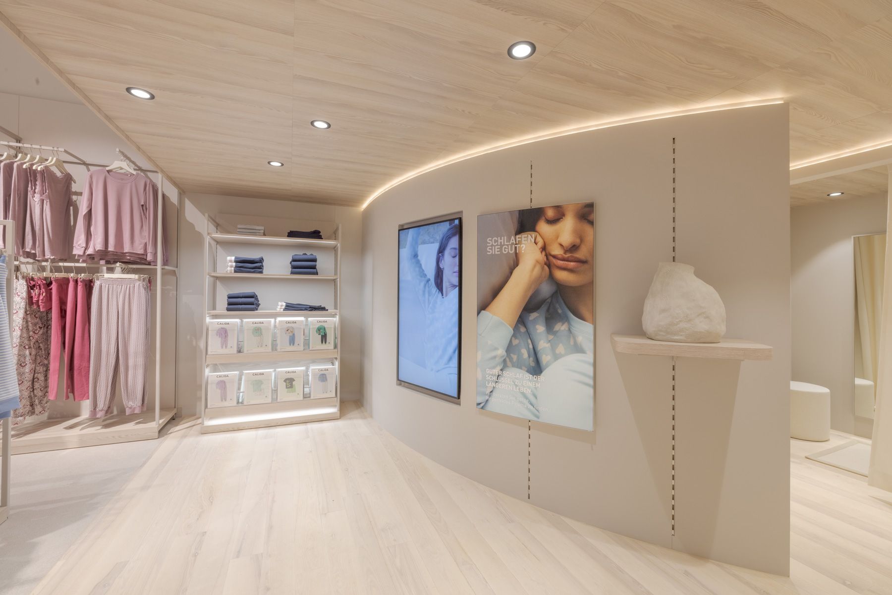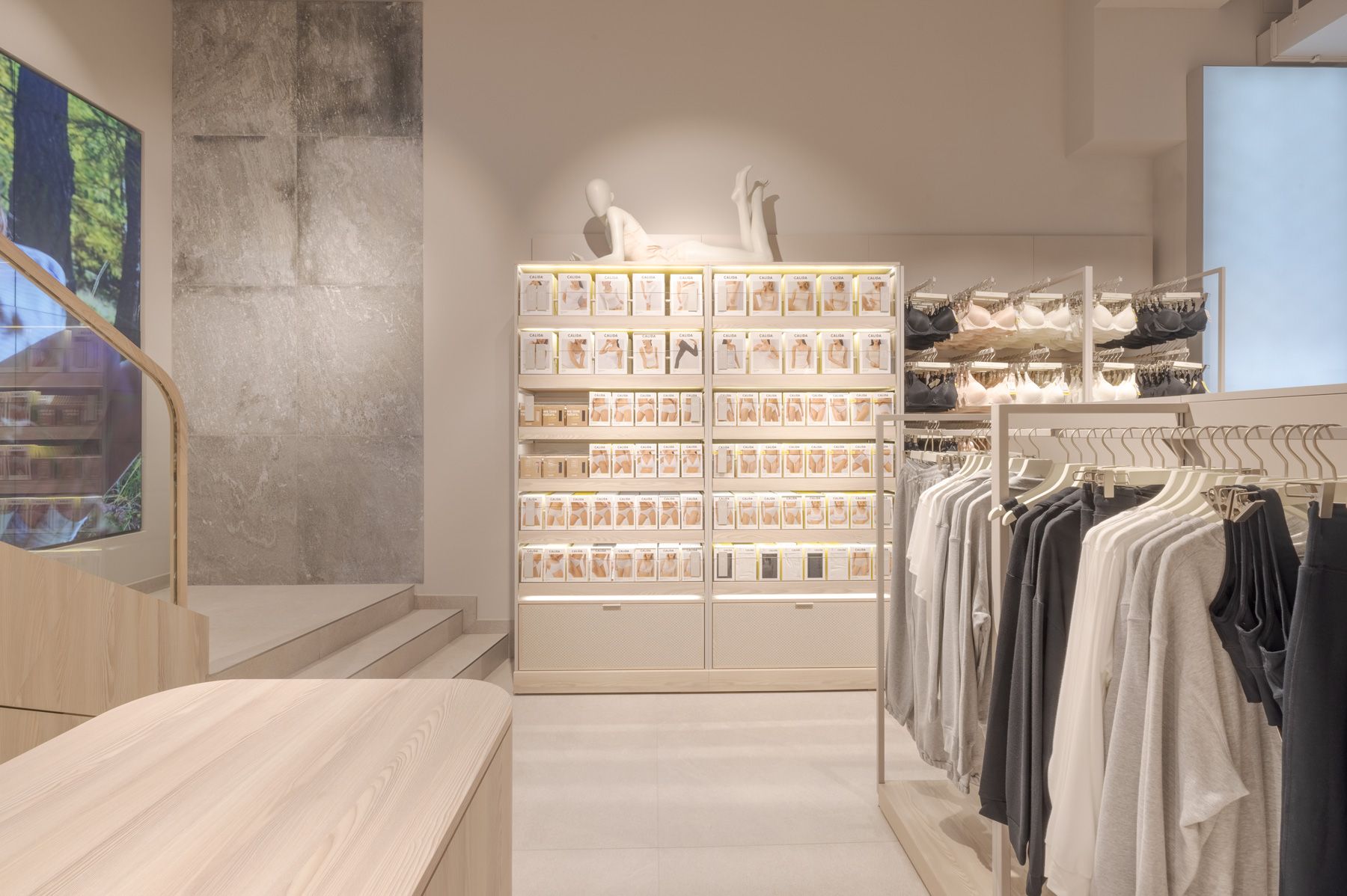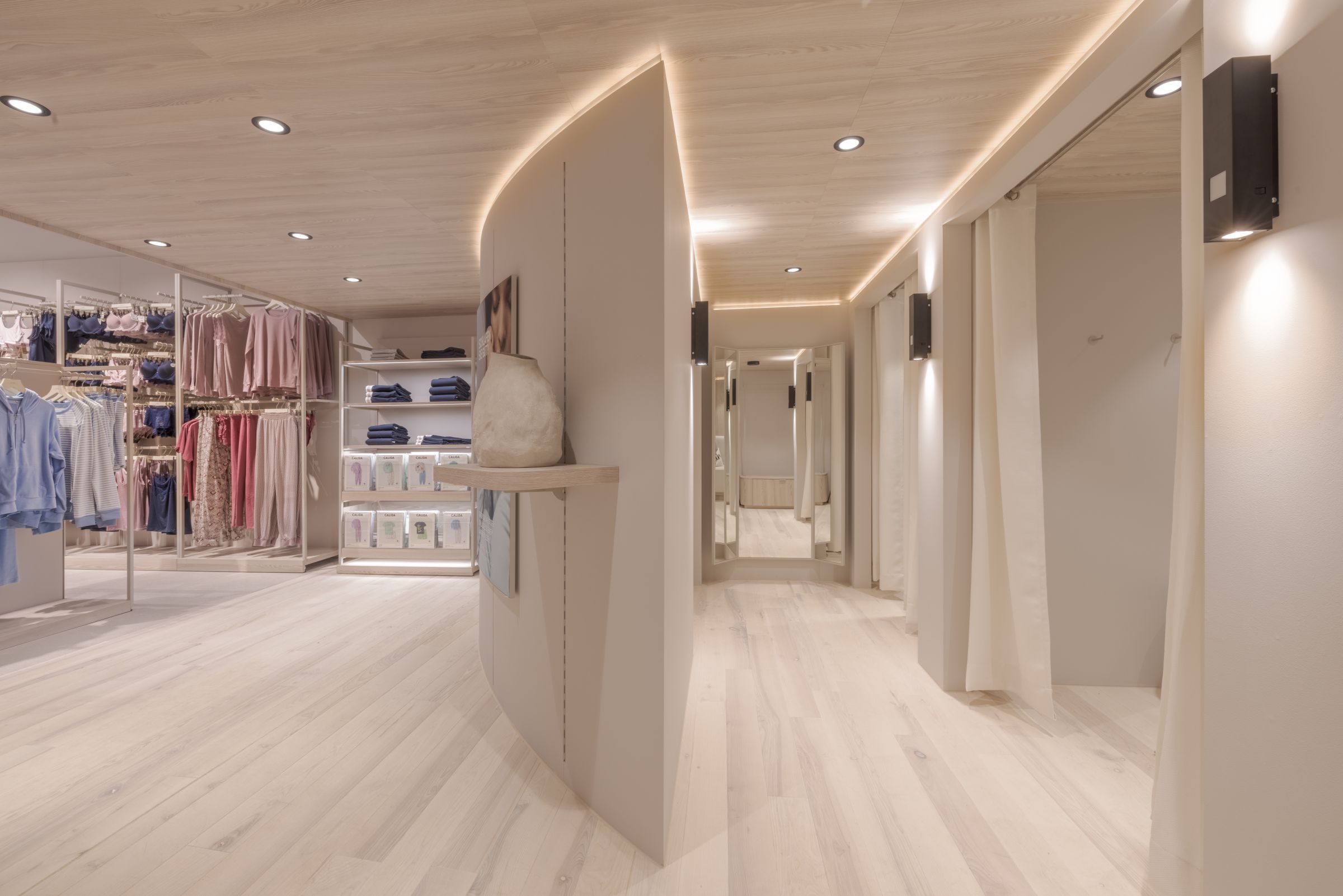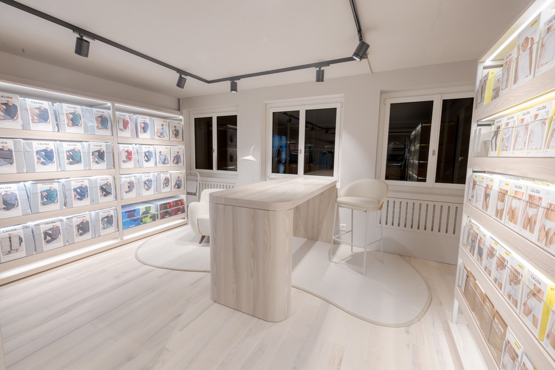 Every design element—from the serene color palette to thoughtfully curated lighting—was carefully selected to create an exclusive yet inviting atmosphere. The layout is both welcoming and refined, encouraging customers to engage with Calida’s premium textiles in a space that feels peaceful and inspiring.