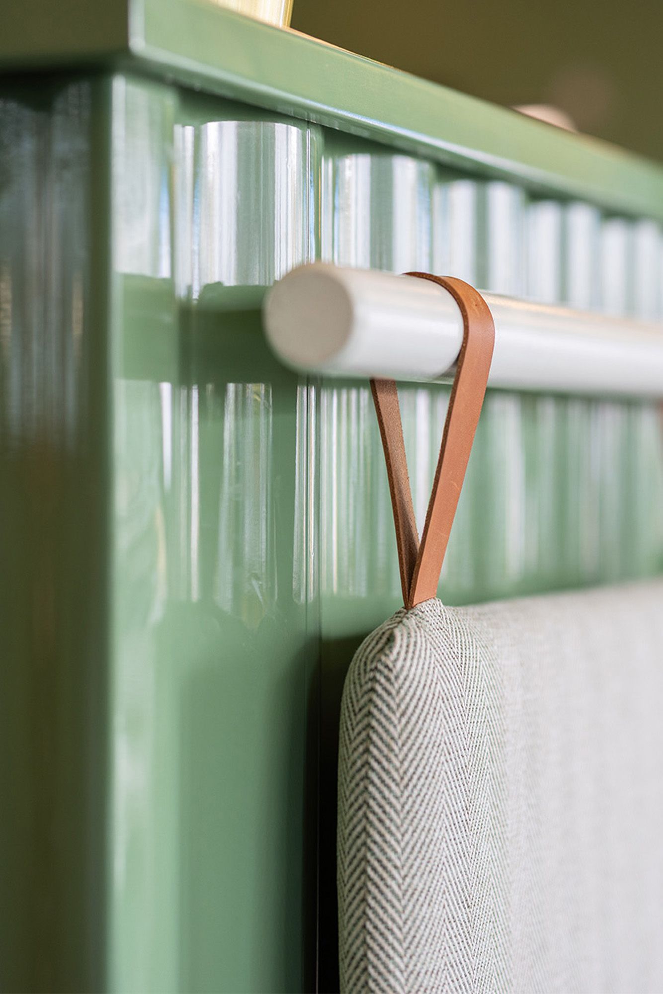 The warm colors of the interior are complemented by natural pastel tones for the brand appearance. A soft peach color harmonizes perfectly with the green tones, creating a cohesive and inviting visual identity.