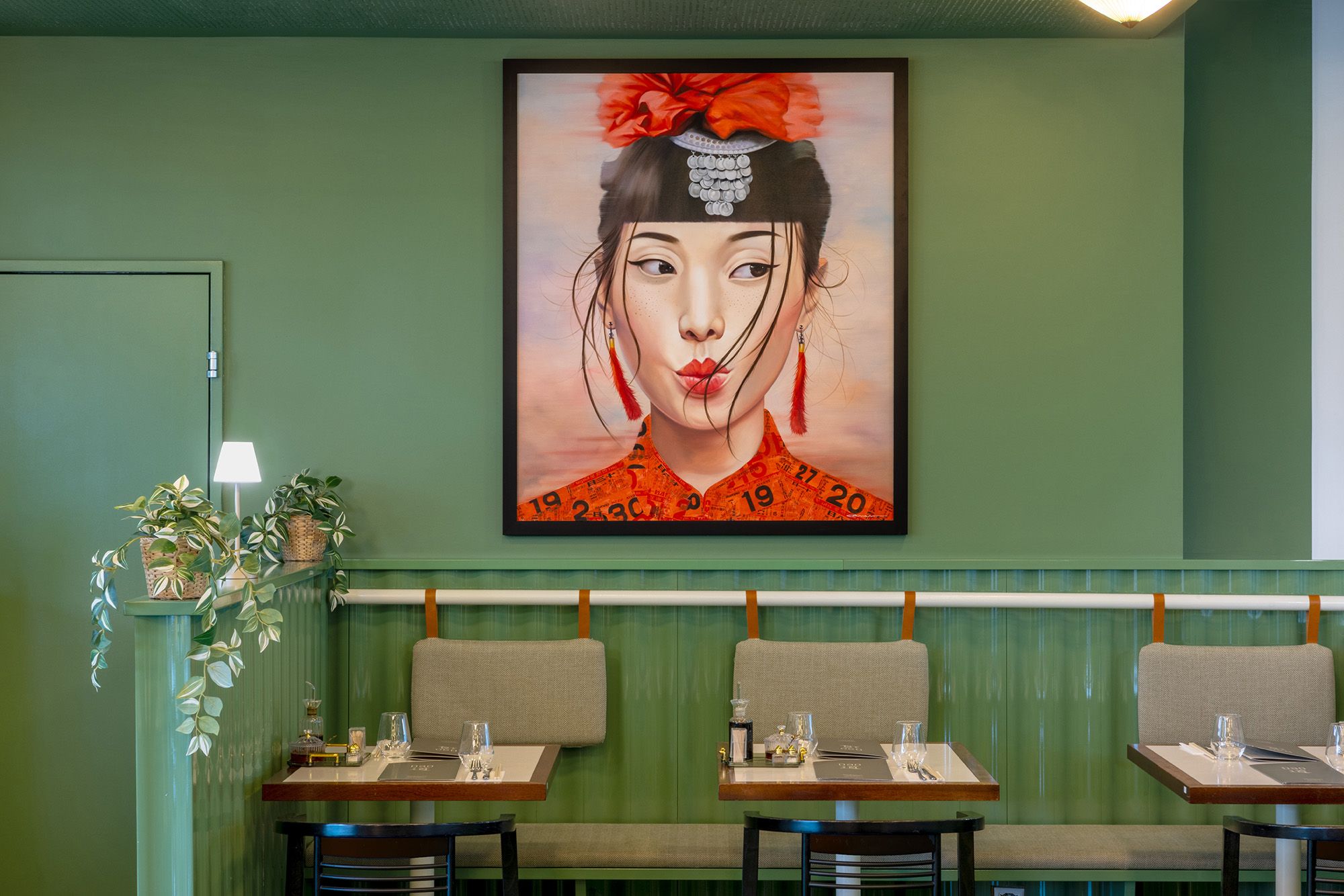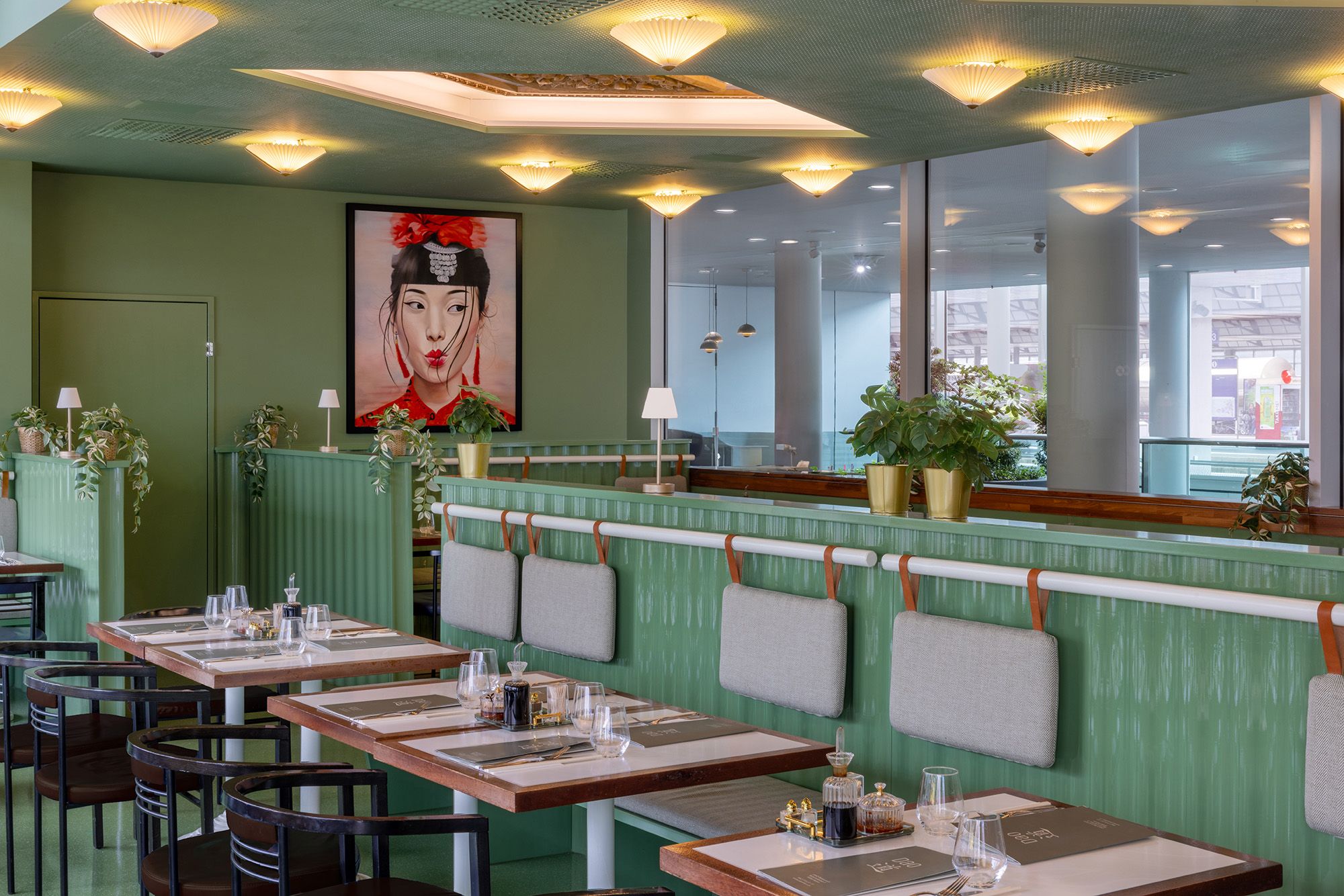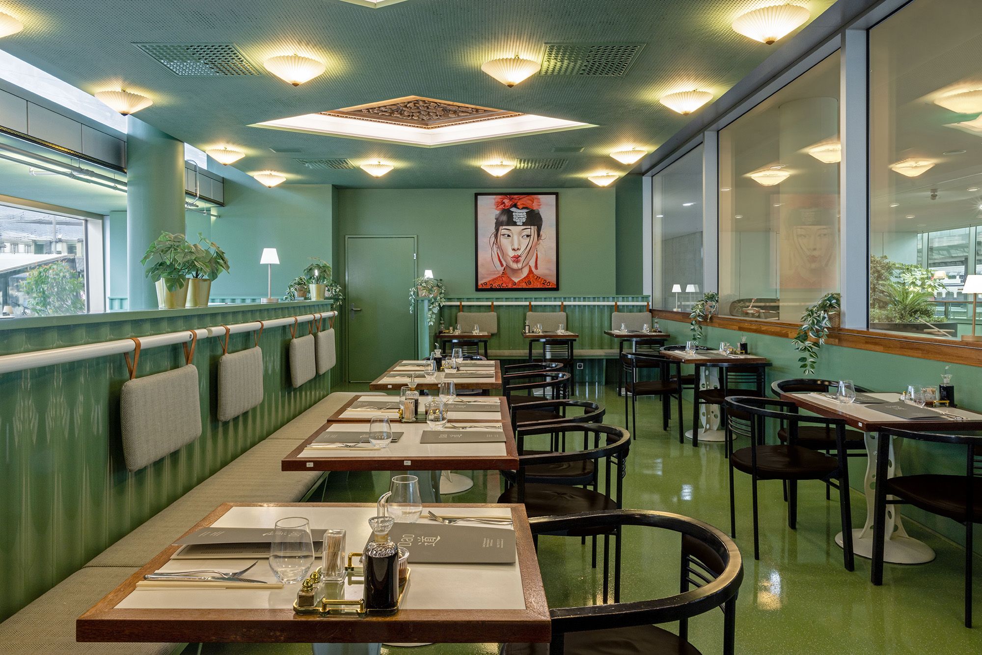 DAO is an innovative pan-Asian restaurant chain, distinguished by its monochromatic green color palette. The design is captivating, featuring a mix of matte and glossy surfaces that make both the takeaway and dining areas visually striking.